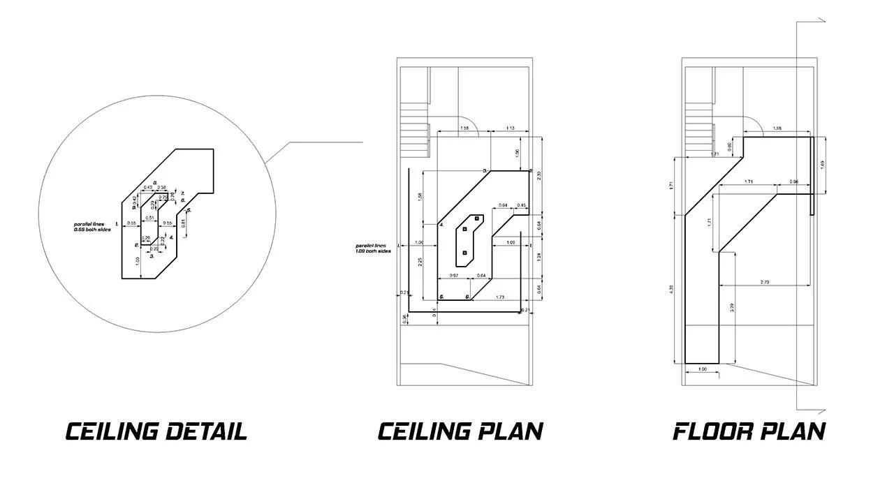 The wooden flooring acts as a guiding path, starting from the entrance and leading toward the reception area. Its logic then continues upward, becoming the main feature of the ceiling. Positioned with a precise, aerodynamic geometry, the ceiling enhances the sense of movement while regulating the overall lighting atmosphere created by its carved, angled form.