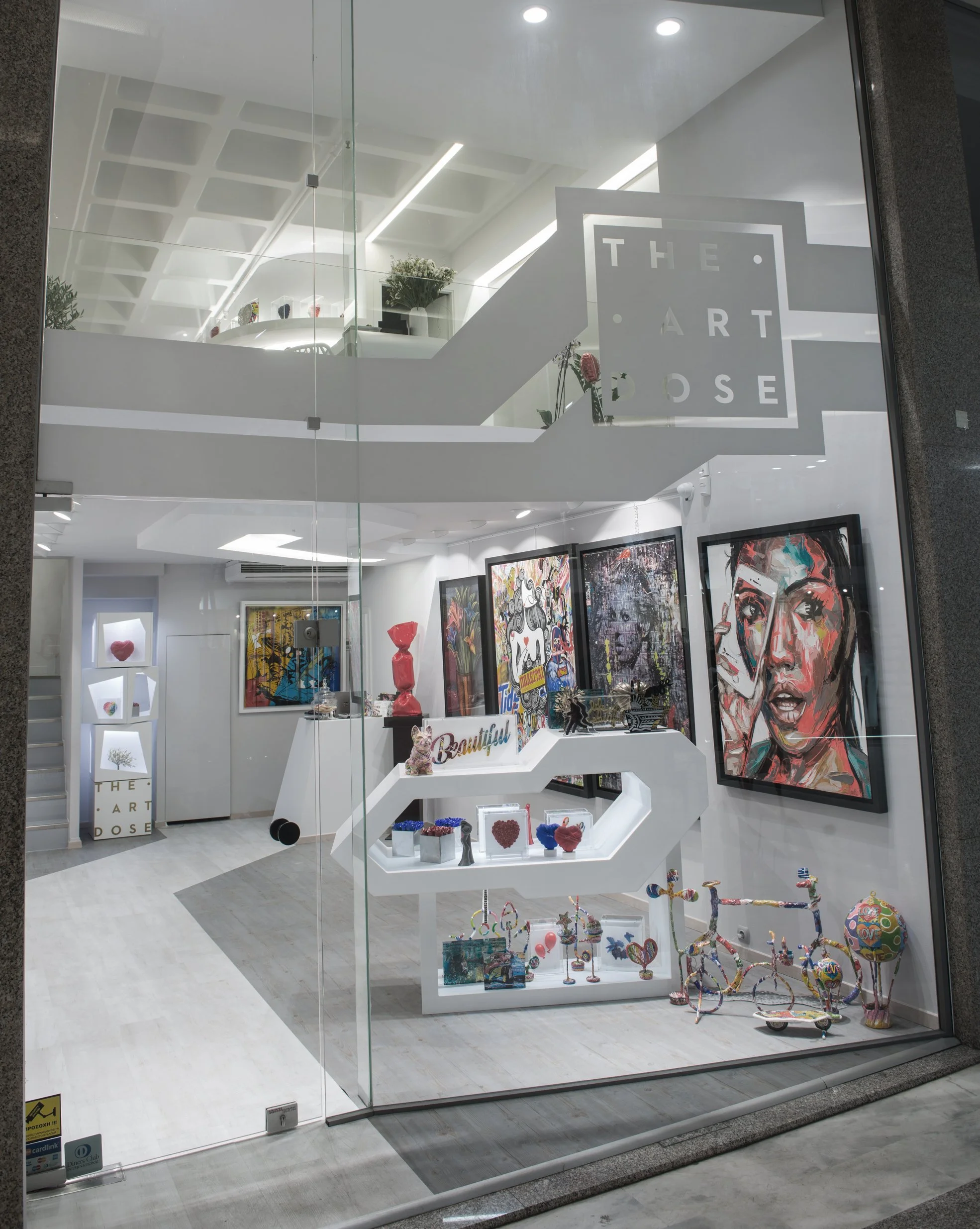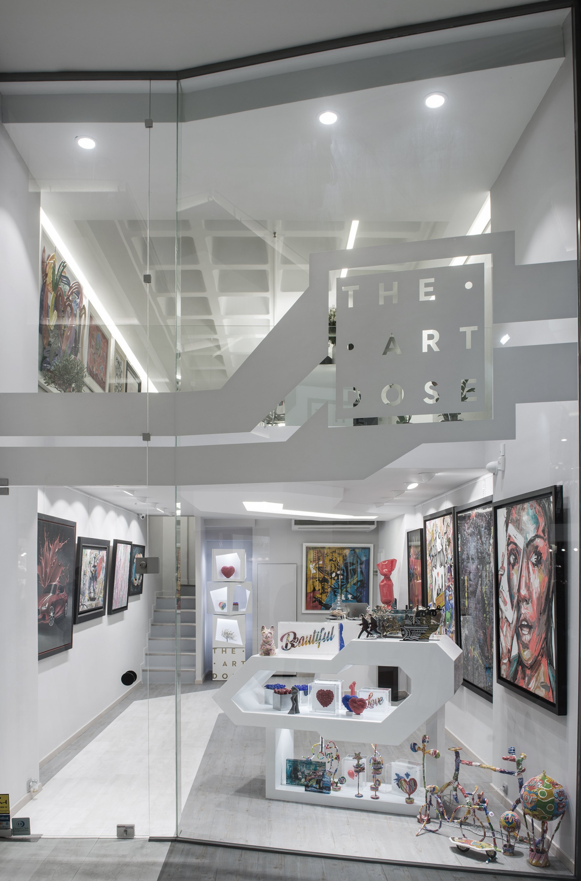 The storefront design reflects the same interior language: the geometric lines of the entrance signage and the custom fiberglass display form the final aerodynamic gestures of the architectural composition, extending the interior identity outward to the street and framing “The Art Dose” as a unified spatial experience.