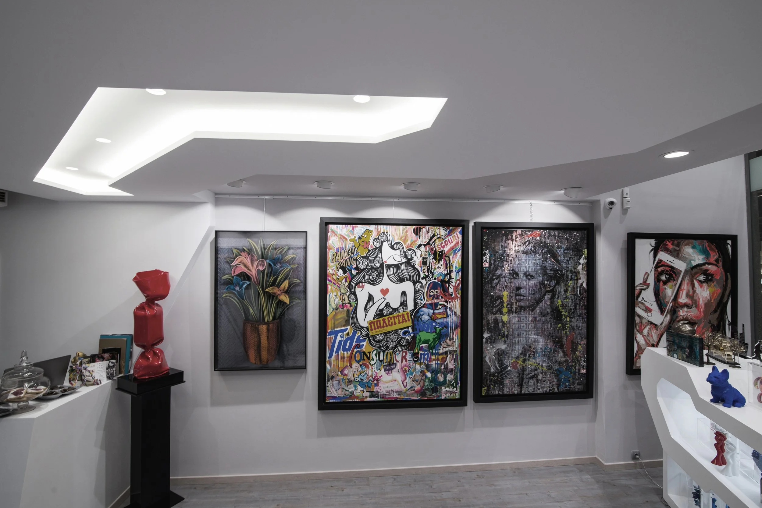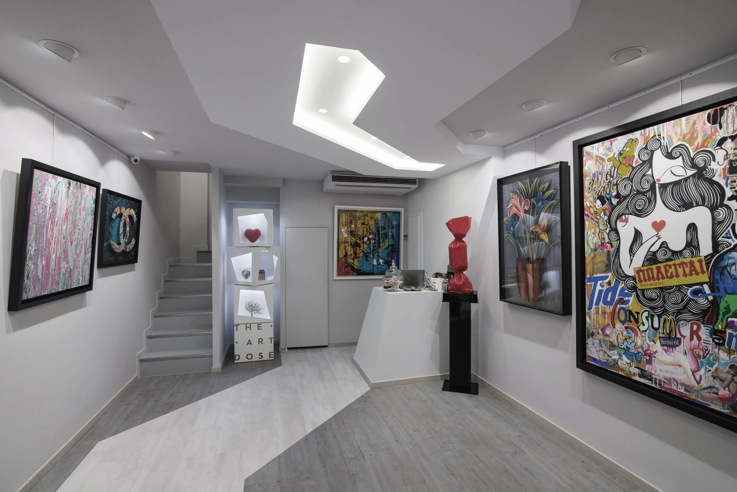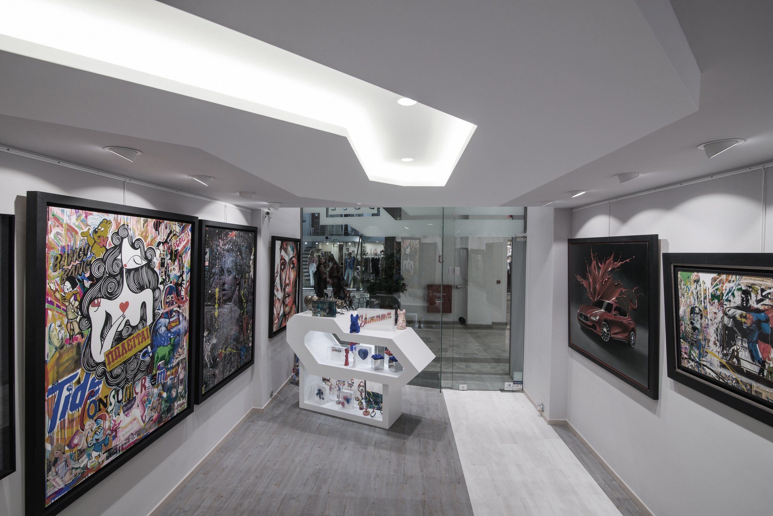 The design intention of this project is to merge a minimal aesthetic with elegant, dynamic lines, forming a balanced and cohesive spatial composition. All vertical surfaces operate as a clean backdrop for the gallery’s artworks, while the floor, the integrated reception desk, and the sculpted ceiling take on the role of a three-dimensional, autonomous architectural element that flows through the space.